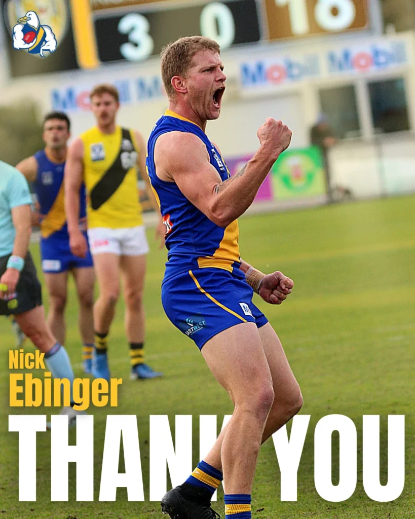 Across eight seasons at Williamstown, Ebinger became a highly valued member of the club’s forward line, recognised for his strength in one-on-one contests, strong attacking craft and his ability to impact games when the team needed it most.